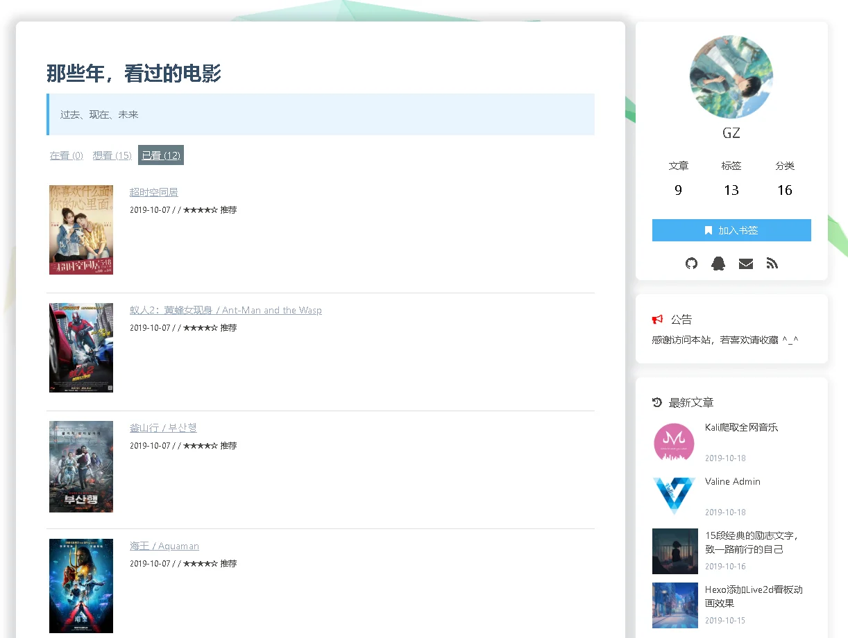 Hexo-Douban —— 一个在 Hexo 页面中嵌入豆瓣个人主页的小插件,能够在Blog同步豆瓣个人主页信息。