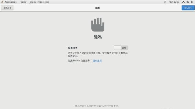 安装完成后,执行下面的命令:startx,启动图形界面,选择中文,点击前进